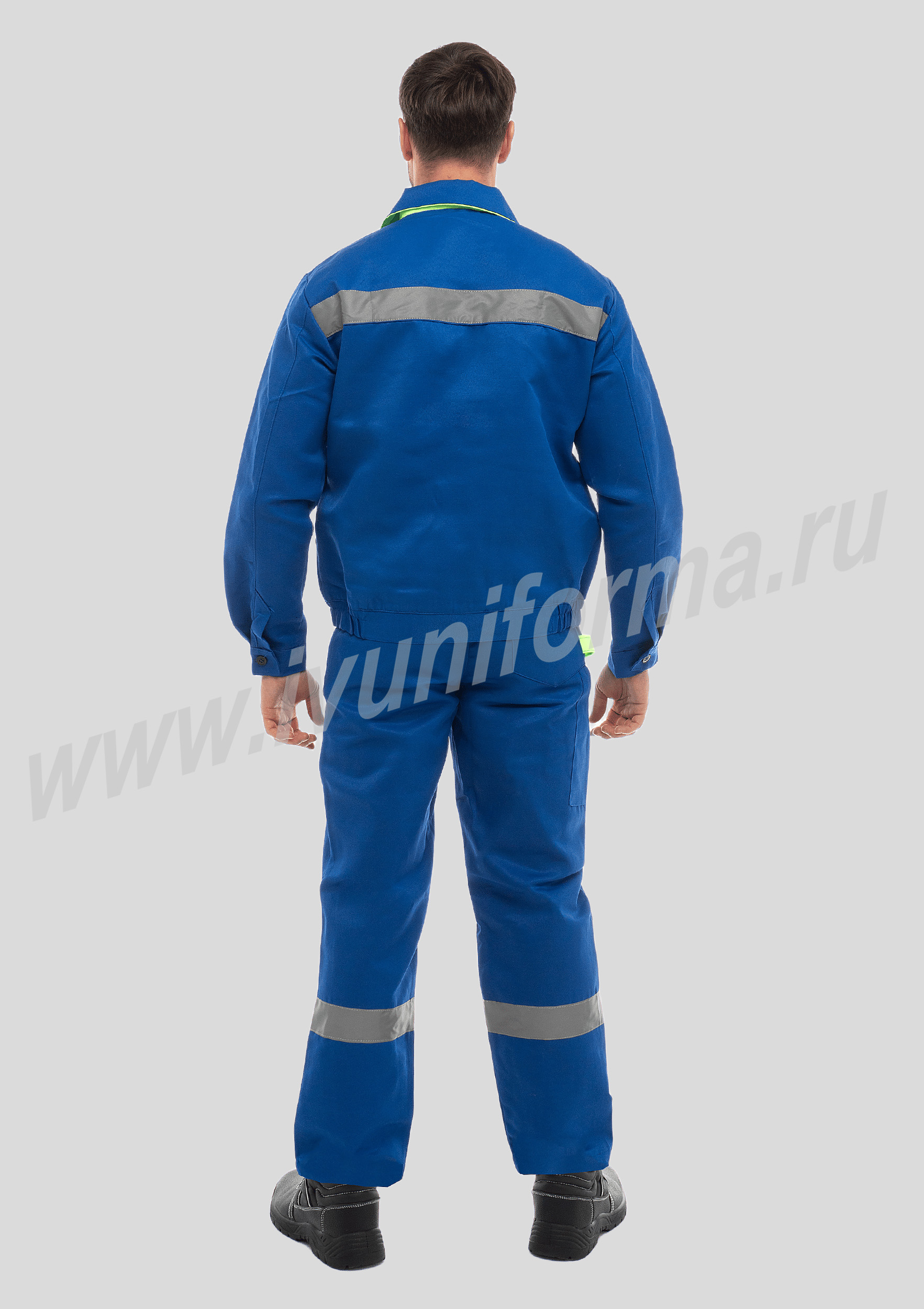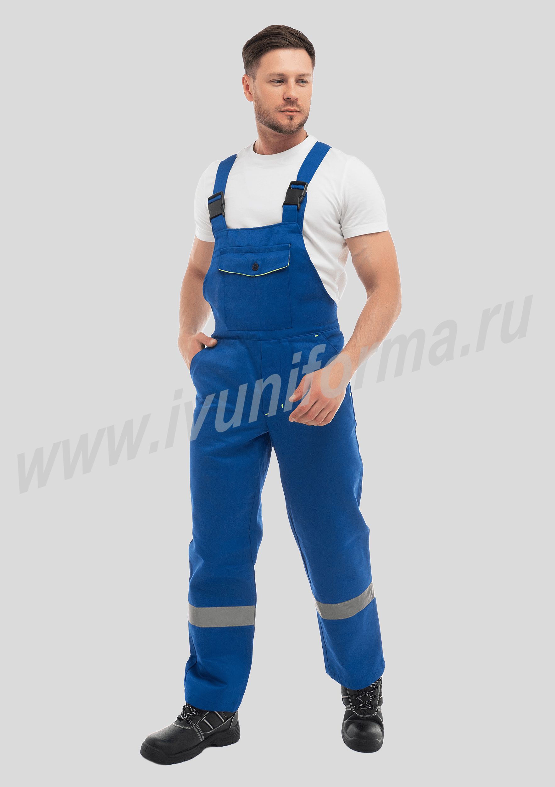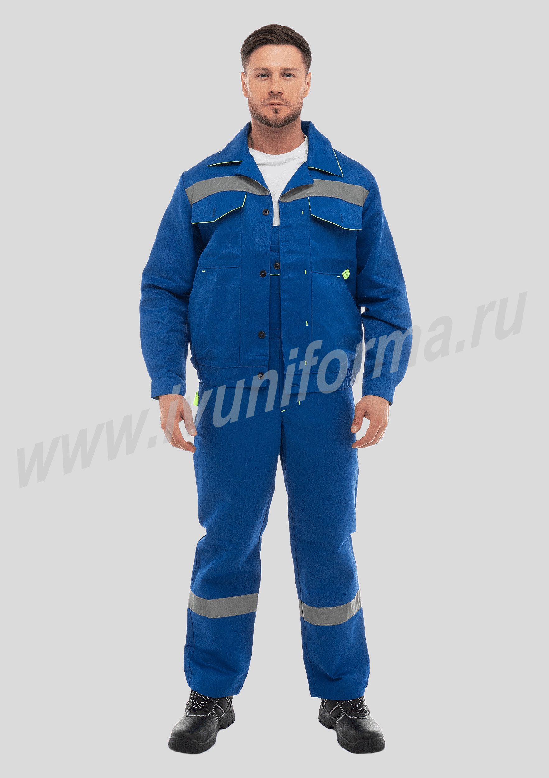 Костюм рабочий мужской состоит из куртки и полукомбинезона. Куртка с потайной застежкой на пуговицы и двумя накладными карманами, регулируется по низу эластичной лентой. Полукомбинезон с застежкой на пуговицы. Костюм оснащен лентой СВП-50 мм по груди и низу полукомбинезона. Костюм рабочий мужской с СВП предназначен для защиты от общепроизводственных загрязнений и производственных травм.